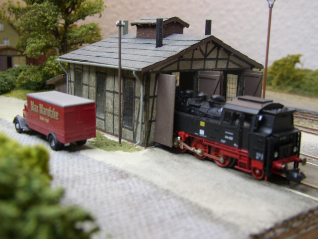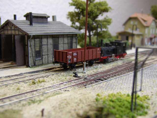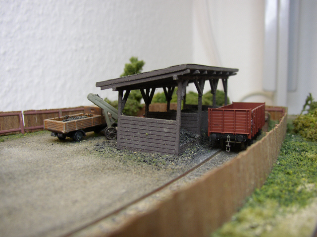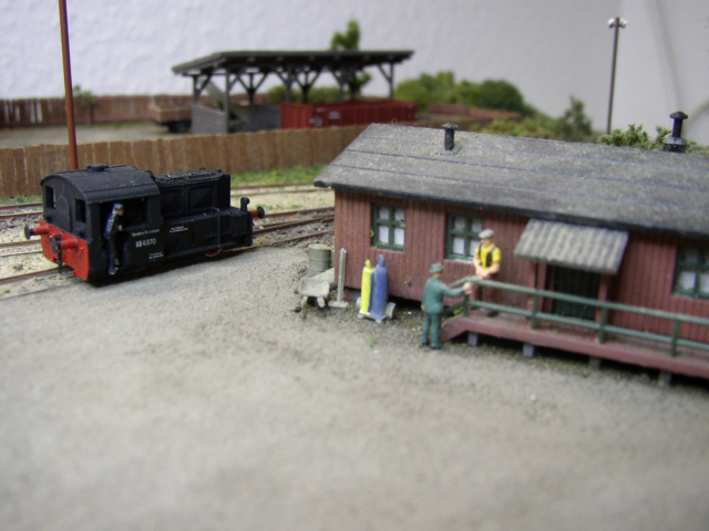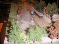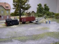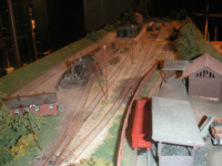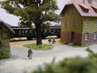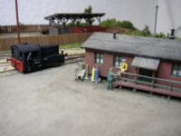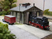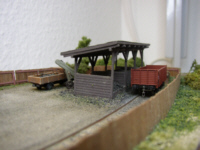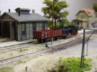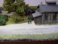 Der Unterbau enstand aus Spanplatten-Verpackungsresten (was ich aus Gewichtsgründen im Nachhinein bedauere). Als Gleismaterial habe ich Peco Finescale-Material (Code55) verwendet. Die Weichen werden manuell mittels Stellstangen bedient. Empfangsgebäude sowie Lagerschuppen stammen von Kibri, die Gleisarbeiterbaracke von Faller, die Bekohlungsanlage kommt von Brawa. Alle anderen Gebäude entstanden im Eigenbau. Gefahren wird analog mit der altbekannten Z-Schaltung. |