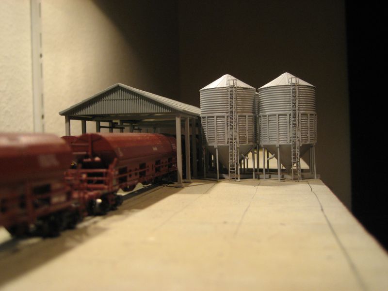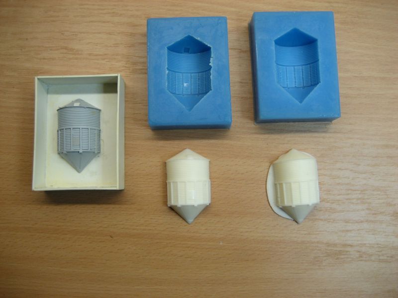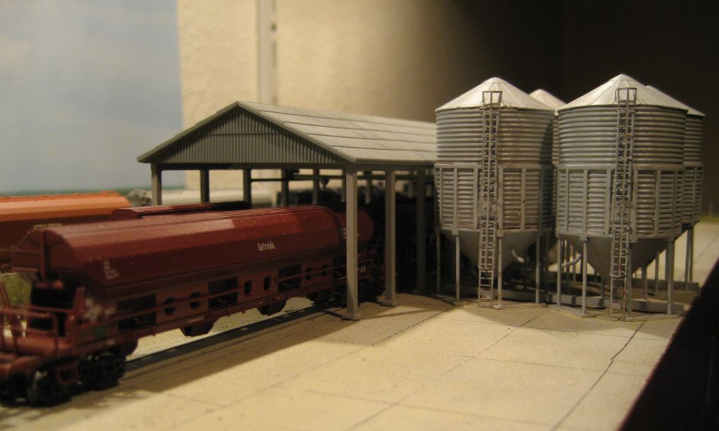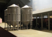 Nach Verputzen der Abgüsse wurden die Hälften mit Sekundenkleber verklebt. Die Stützen entstanden aus 1mm-Messingdraht, die Fördertechnik (Rohrschnecken, Becherelevatoren und Trogkettenförderer - siehe hierzu auch: Denis Privé GmbH Förder- und Lagertechnik) aus den verschiedensten Polystyrol-Profilen von Evergreen. Komplettiert wurden die Silos mit Leitern aus dem Sortiment von Ndetail. Nach dem Lackieren erfolgte nur eine dezente Alterung, da hier auch beim Vorbild auf Sauberkeit geachtet wurde (und trotzdem wird sich sicher die ein oder andere Maus sehr wohl gefühlt haben). |